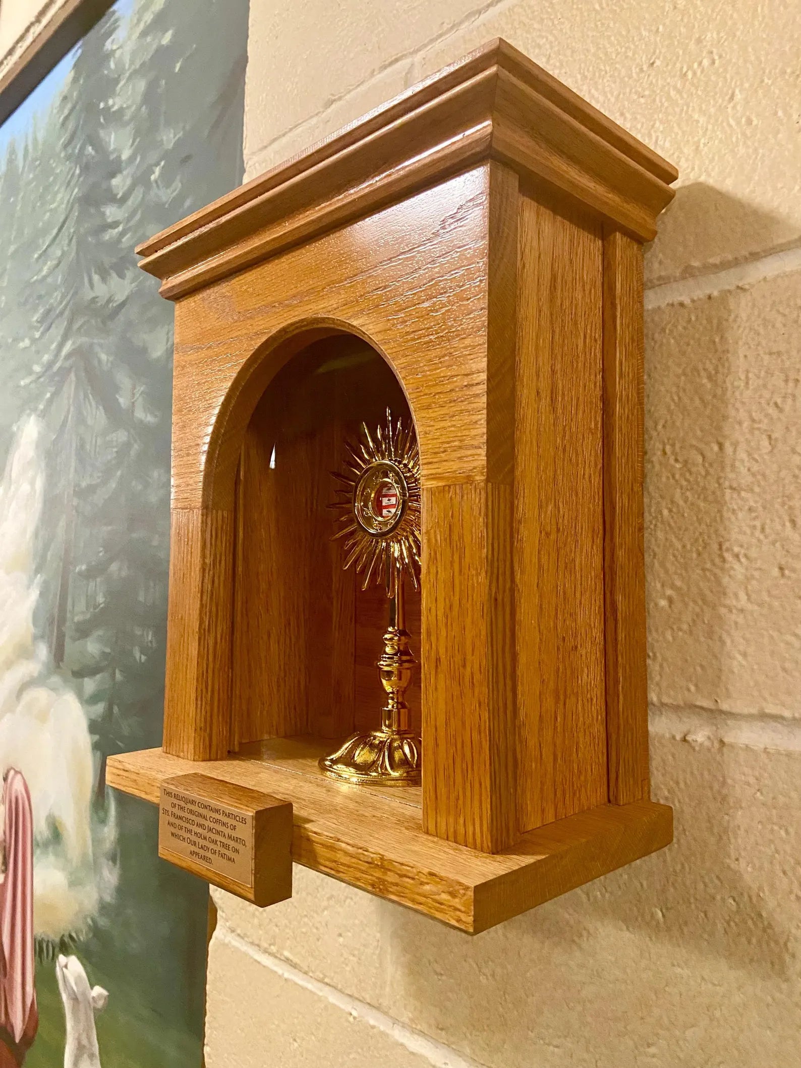 Each niche is made one at a time in our Kentucky workshop using traditional joinery, precise shaping, and careful hand finishing. The result is a liturgical-grade wood shrine worthy of displaying first- or second-class relics of the saints — a piece that invites prayer, reflection, and devotion.