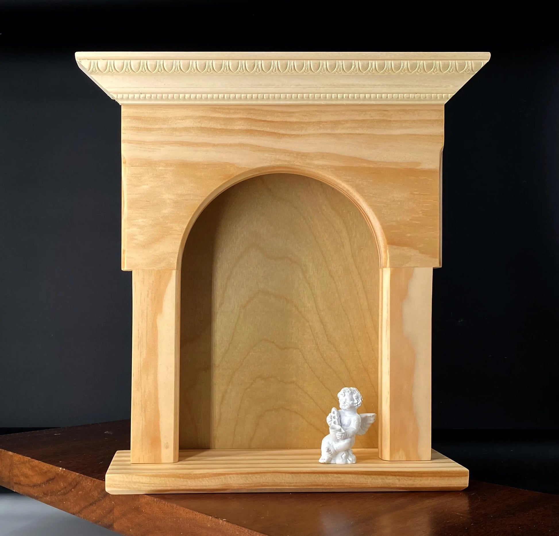 Bring a quiet space for prayer and devotion into your home with this handcrafted altar shrine. Made from warm solid white pine, its elegant arched frame and compact proportions create a centered, sacred focal point for a prayer corner, home altar, bedroom, or devotional nook.